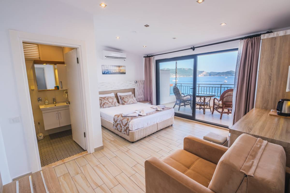Deluxe – Deniz Manzaralı Double Oda, Kaş’ın büyüleyici Akdeniz manzarasına bakan, modern tasarım ve konforu bir araya getiren özel bir oda tipidir. Ferah yapısı ve şık dekorasyonu sayesinde misafirlerine hem dinlendirici hem de keyifli bir konaklama deneyimi sunar.